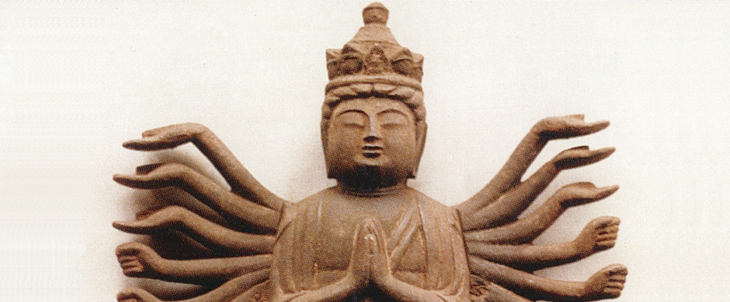 頭上には超能力と慈悲を表すように十一の面を戴き、両肩から脇手が蝶の羽のように扇状に美しく広がる、均整のとれたお姿が特徴です。その後、弘安元年(1278年)に大内弘貞公が百済より守護仏として持ち帰られた「金仏千手観音」を納められ、本尊と改め普慶寺を本坊とされました。